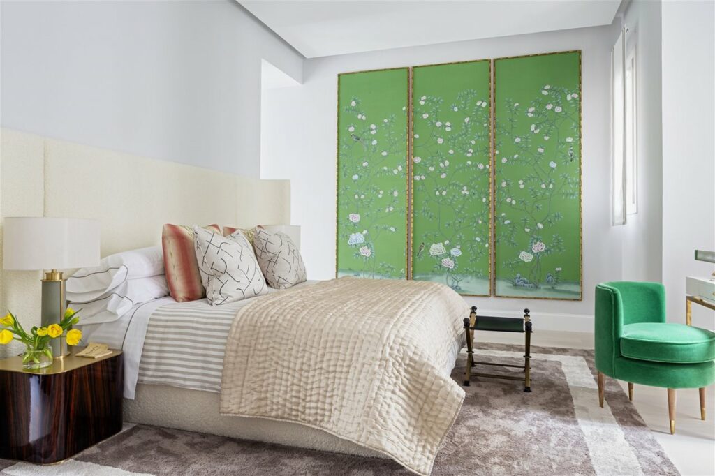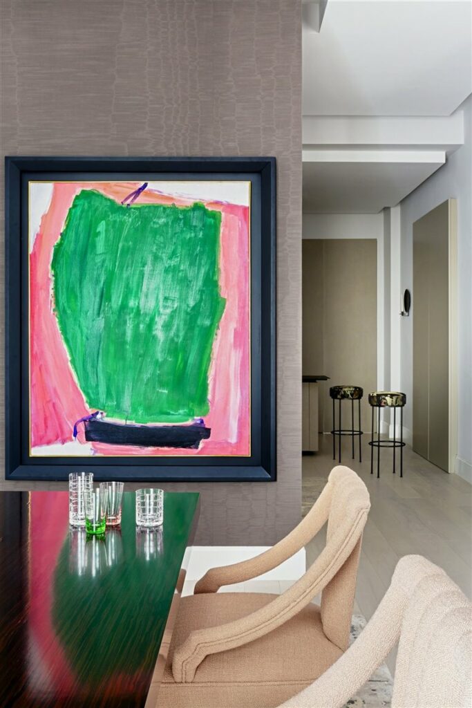 Cada espacio de la casa tiene su propia personalidad y tonalidad y así lo explica Patricia: «El hall con cocina vista al comedor y salón hemos optado por un papel seda gris oscuro de Dedar Milano para conectar con los tonos oscuros de la cocina. Vestimos el hall en tonos neutros, jugando con el blanco y el negro, para mantener un equilibrio en el que pudieran convivir con las potentes obras de arte del apartamento». En la habitación principal el verde jade es el protagonista “sus grandes paneles en seda pintada a mano son auténticas obras de arte y la mezcla del verde y el color beige del cabecero XXL, hecho a medida por Studio Bañón, hace que la combinación de tonos sea perfecta», detalla la interiorista que en el despacho ha optado por tonos neutros en blancos y negros, combinados para crear un juego óptico muy arty.