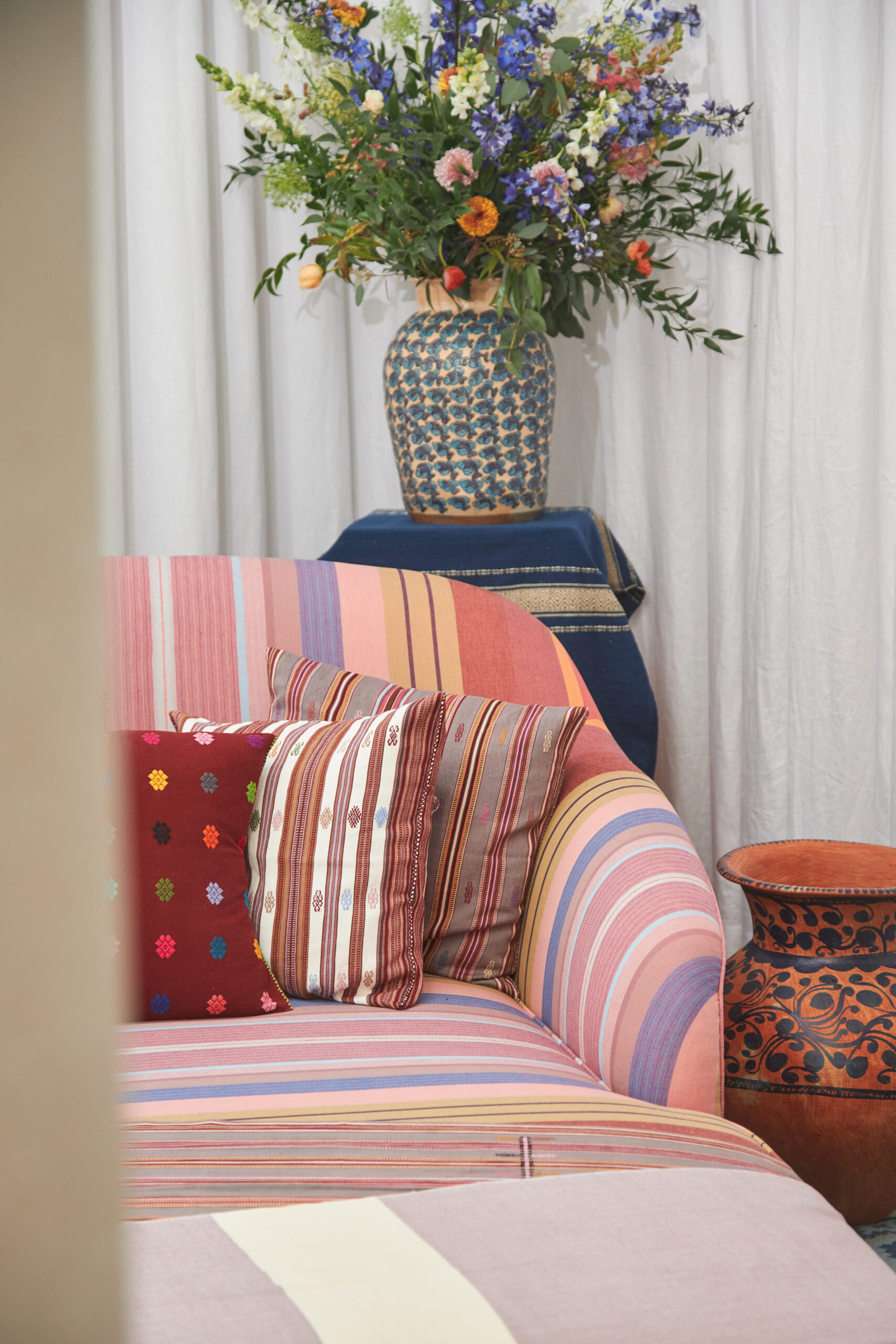 El textil, una pieza clave en la identidad de La Cama Mexicana, ha sido tejido a mano en telar de pedal por los maestros artesanos Felipe Pérez y Juana Hernández en Chiapas. Su patrón multicolor refleja la riqueza y el simbolismo del textil tradicional mexicano, funcionando no solo como un elemento decorativo, sino como un testimonio vivo de la herencia cultural que inspira este proyecto. Además, su diseño permite ajustarse tanto en horizontal como en vertical, aportando dinamismo y versatilidad a la pieza.