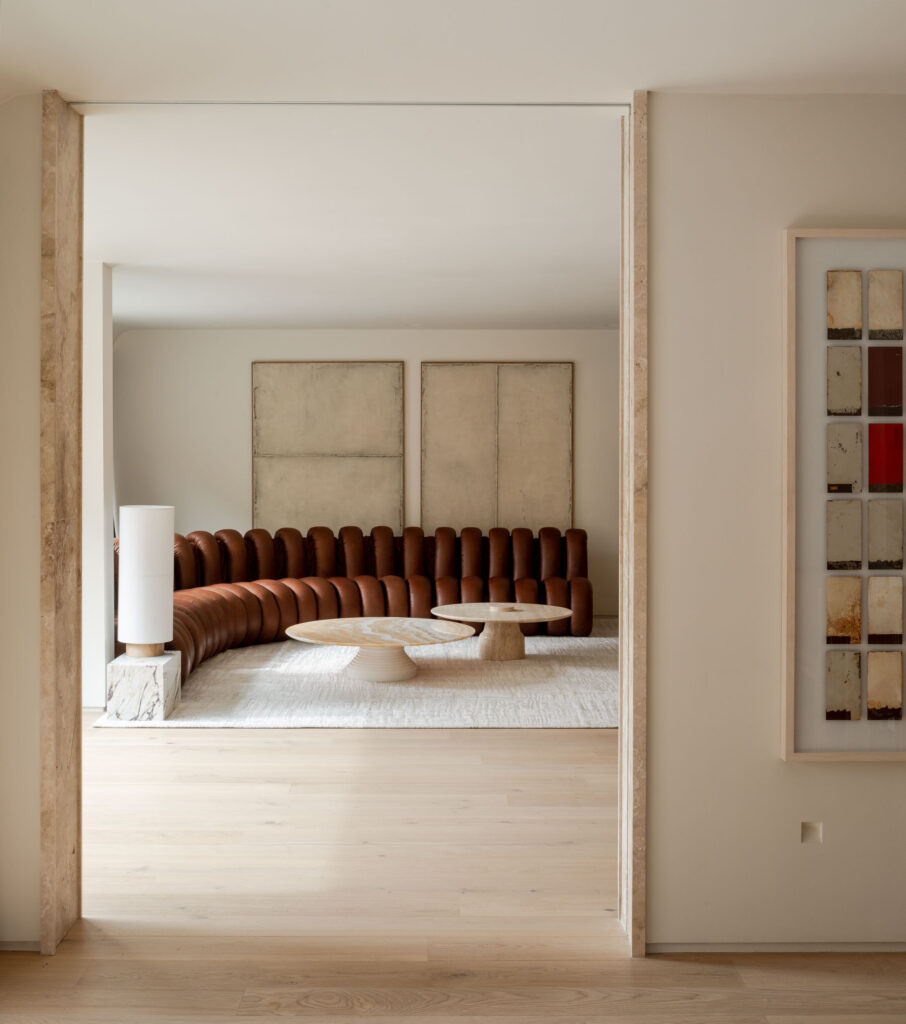 La Villa Studio comparte en este artículo su principal objetivo: devolver vida y luminosidad a este espacio. El equipo de arquitectos lo logró al diseñar un pasillo que permite que la luz fluya desde las ventanas hasta el salón principal. Con una paleta de colores dominada por tonos marrones y neutros, los materiales destacados incluyen roble y piedra natural. Estos colores neutros proporcionan un lienzo perfecto para las obras de arte cuidadosamente seleccionadas.