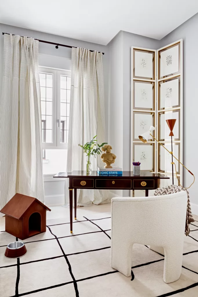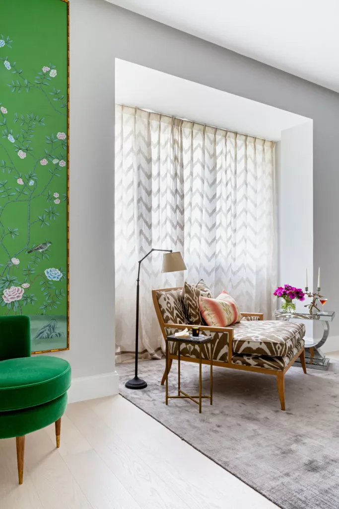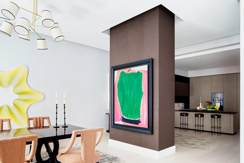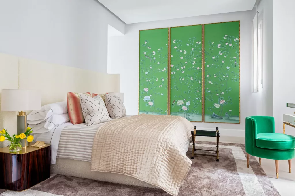 En cuanto a la paleta de colores, el gris claro es uno de los grandes protagonistas. “Elegimos una paleta de tonos cálidos y metálicos para conseguir un estilo sofisticado”, explica Fernández Castro. “Para ello, partimos de un gran mural de un clásico jardín chino hecho a medida por la prestigiosa firma italiana Misha Wallcovering”, añade. Tejidos y texturas de la nueva colección de Dedar Milano, se suman a esta combinación aportando lujo refinado. Un papel seda gris oscuro conecta el hall con la cocina, en cuanto a colores. Este hall, está vestido en blanco y negro potenciando el diálogo con las obras de arte del apartamento. Mientras, la habitación principal cuenta con toques de color gracias a los grandes paneles en verde jade.