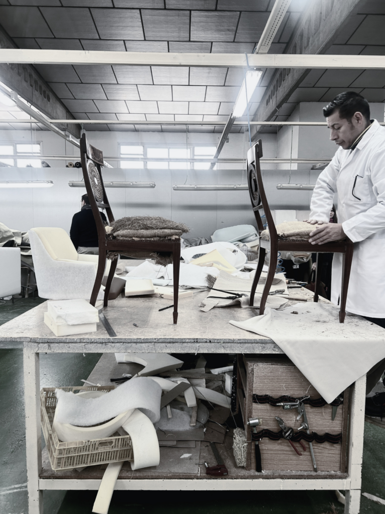 Cada miembro del equipo se dedica a un proceso específico en la confección artesanal de nuestros muebles. Con un respeto profundo por la tradición y un compromiso inquebrantable, cada pieza de Studio Bañón se elabora con la máxima atención al detalle. El enfoque meticuloso en cada proceso refleja la dedicación que se pone en la construcción de nuestros muebles. Todos los procesos se realizan de manera artesanal, y los artesanos, silleros, costureras y tapiceros pasan por una formación exhaustiva antes de unirse al equipo y a la familia Bañón.