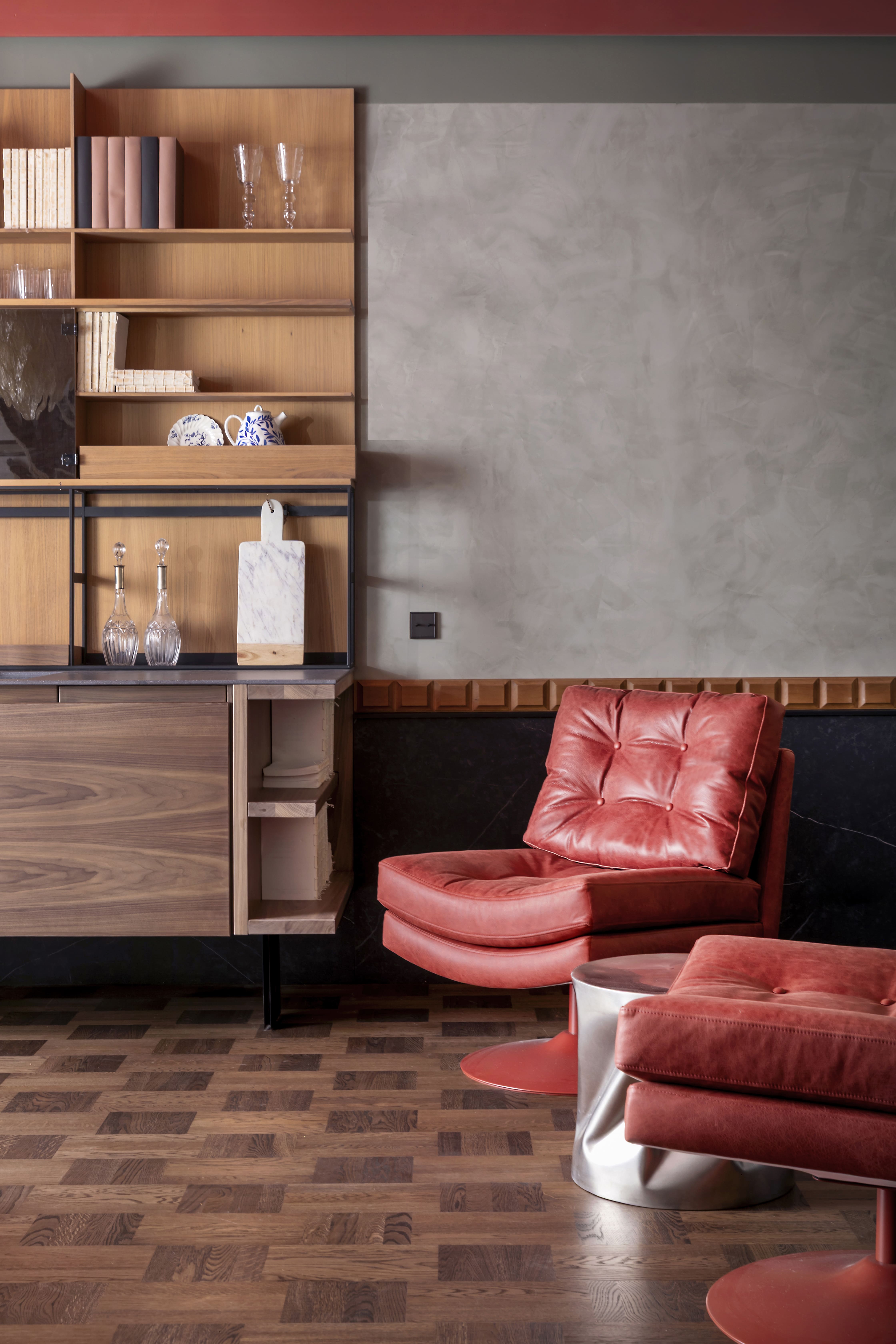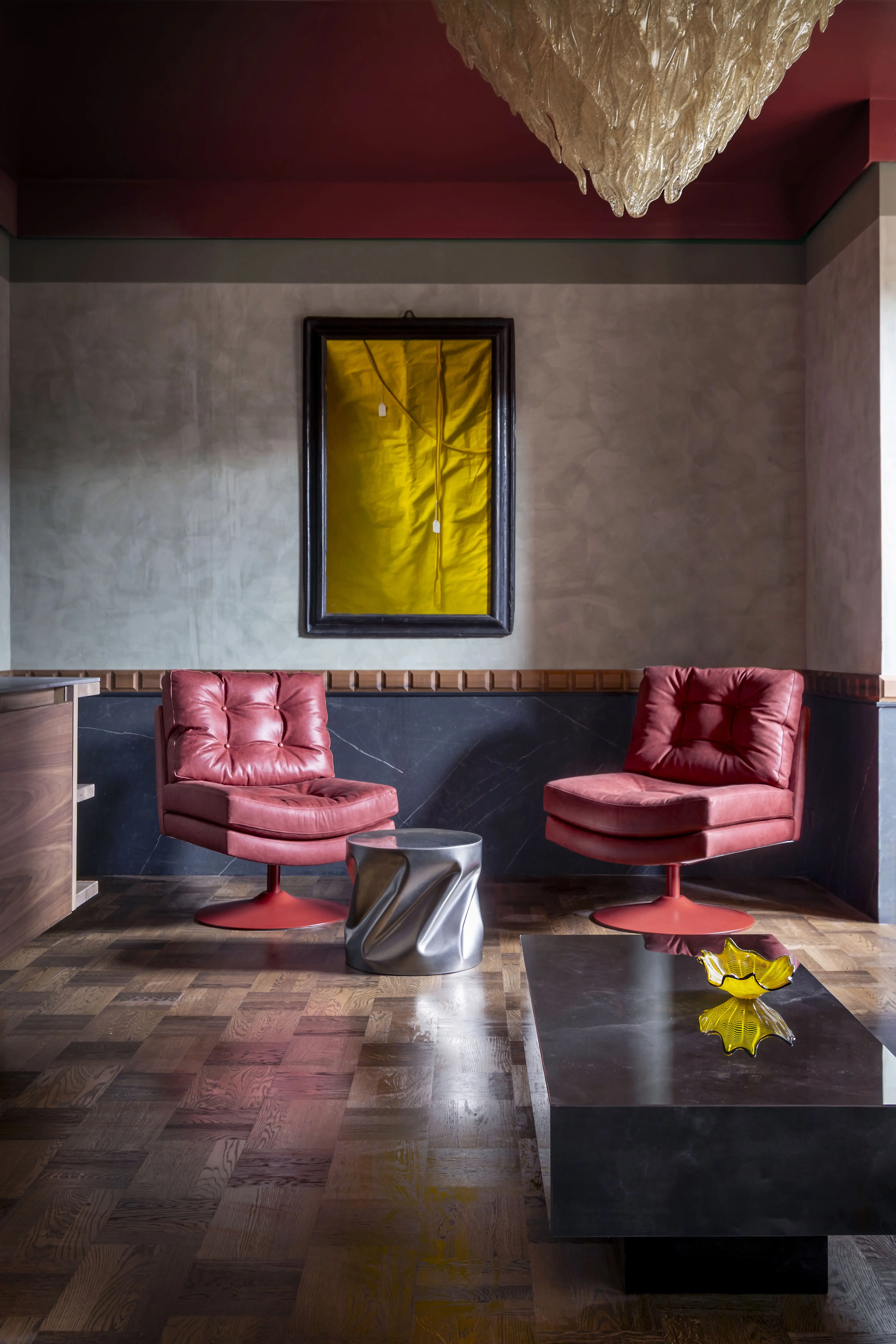 Diseñadas por Ignacio Bañón para el espacio Slowlife, estas butacas sin brazos están confeccionadas en cuero envejecido rojo, un material que aporta calidez y personalidad a la estancia. Su base giratoria permite una versatilidad funcional sin comprometer la estética, logrando una pieza que equilibra confort y con un aire sofisticado.